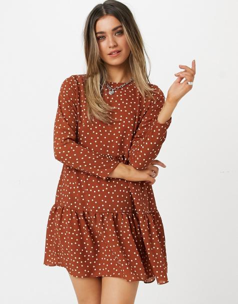 Anne klein polka dot side tie knit jersey faux wrap dress $99.00. Maison tara short flutter sleeve polka dot blouson dress with matching mask $108.00. Women's dress polka dot floral print long sleeve crewneck fishtail ruffle hem short mini dresses. Brand name sanctuary product name earth bound midi dress color earthstone price. Go for bodycon dresses for a sizzling look, or opt for a fit and flare numbers to create a playful appearance.